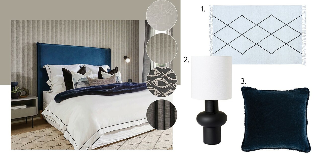 Take inspiration from the Carlisle Homes Piermont 29 display at Redstone Estate and create the look with this edit of coordinating furnishings. 1 - Rug, James Lane, 2 - HARRIETT Black Linen Table Lamp, Madras Link and 3 - Pillow Talk, Navy Valencia Cushion.