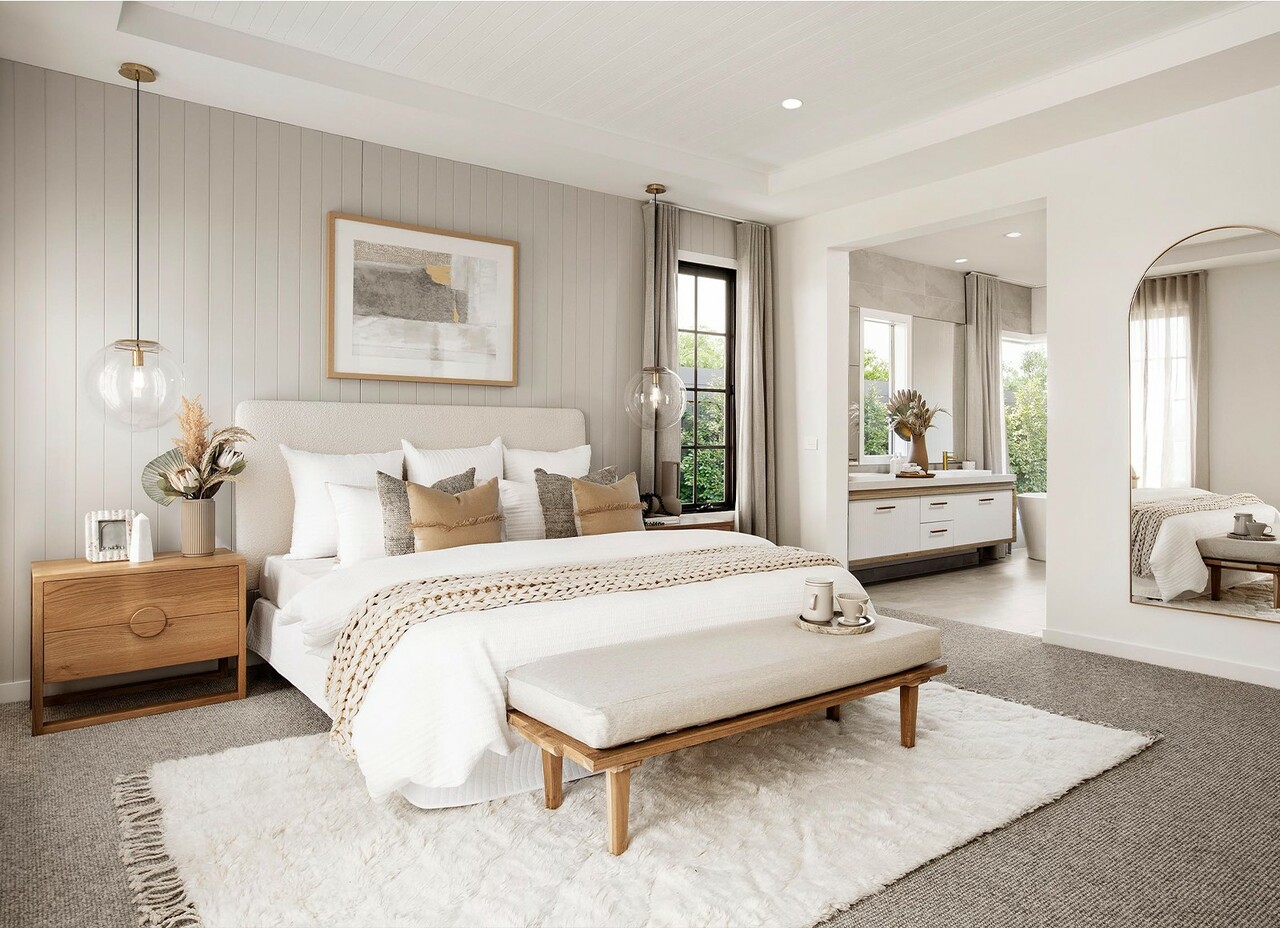The perfect pendant or wall light in the bedroom doubles as a stylish feature and a practical reading light. Featured here: Rothwell, Aurora Estate, Wollert.