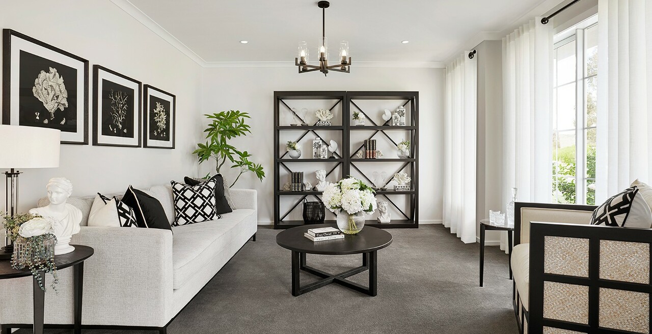 The living room in the Canterbury Grand evokes the opulence and luxury of the Classic Contemporary style, featuring textured materials, dark inbuilt joinery in Laminex Domain and floor to ceiling sheer drapes.