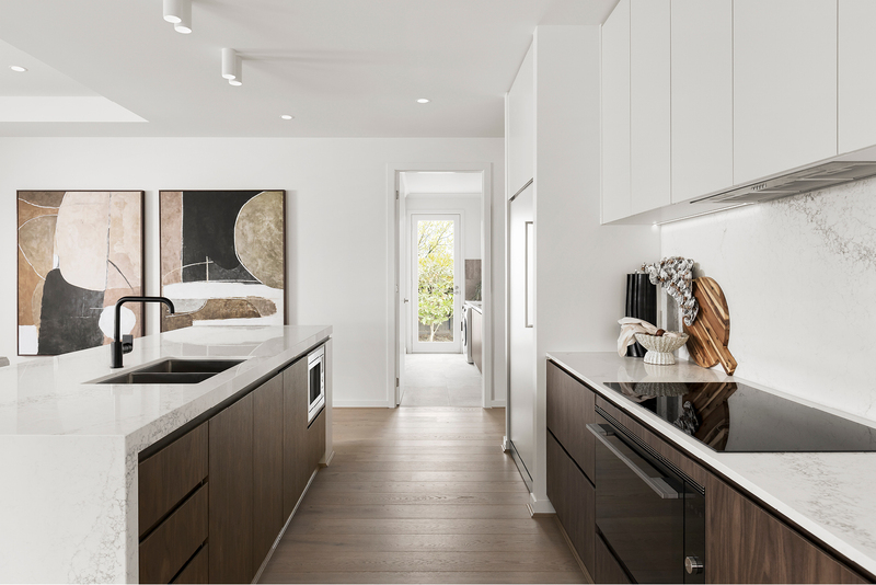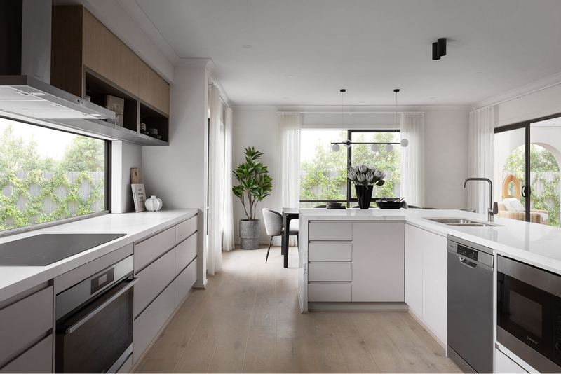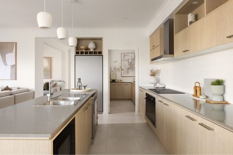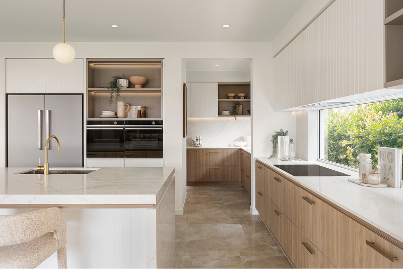 The Granville Grand Pantry kitchen by Carlisle showcases a clean, all-electric design with an induction cooktop and Caesarstone benchtops, creating a healthier, lighter and more streamlined modern kitchen.