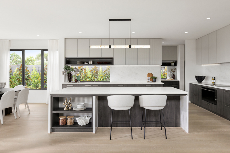 Light meets dark in this Riverfield kitchen interior, where Midnight Oak cabinetry is balanced with Lunar Frost stone benchtops and Oyster Grey overheads for a refined, contemporary finish.