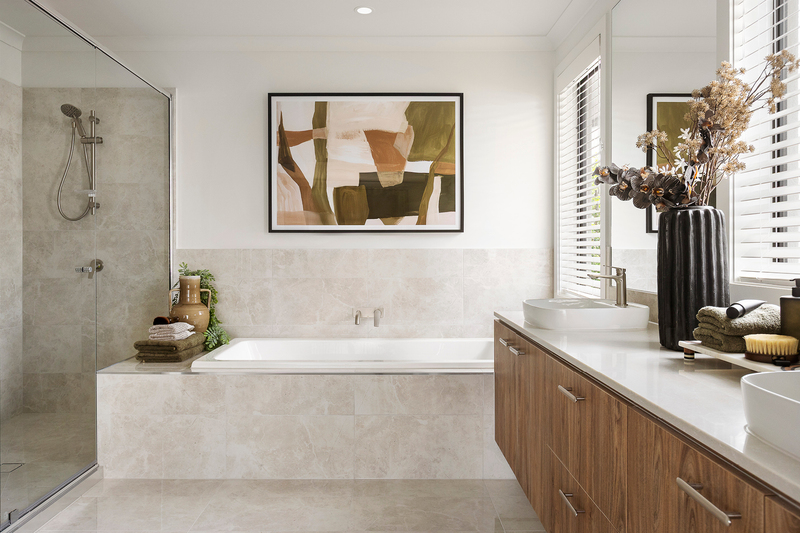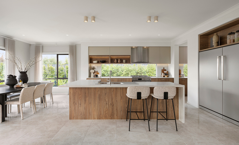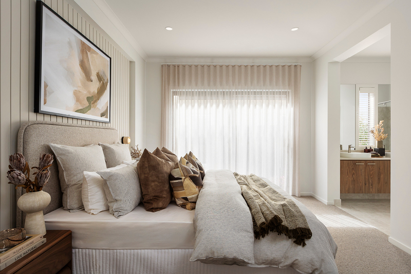 Inside, the Granada at Riverfield embraces the Autumnal Ambience interior scheme – a palette defined by warmth, texture and quiet sophistication. The entertainer’s kitchen is the showpiece, combining rich timber-toned base cabinetry with soft greige overheads, complemented by Caesarstone benchtops and a generous walk-in pantry that can be upgraded with a sink for full butler’s pantry functionality.