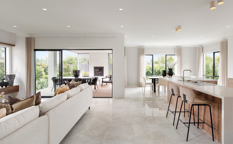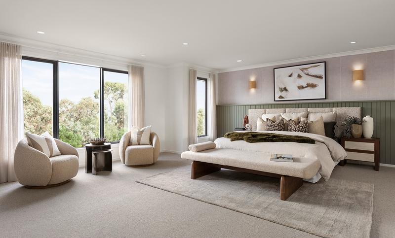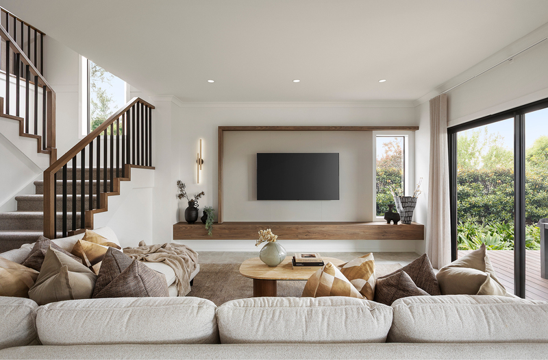 Throughout the home, muted neutrals and layered textures create an inviting calm. Floor-to-ceiling tiles and refined finishes bring gentle luxury, while touches of earthy green, chocolate brown, and warm timber reflect the tones of autumn and the comfort of cocooning nature.