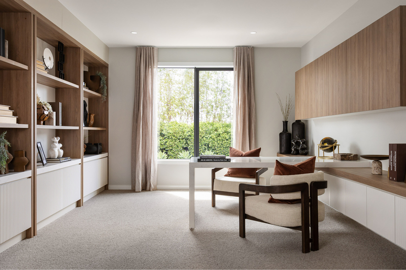 At the front of the home, a calm formal lounge sits apart from the main living zones, ideal for hosting guests or enjoying quieter moments. Nearby, a flexible study and a generously sized powder room with shower add versatility, allowing this zone to adapt over time without disrupting the rest of the layout.