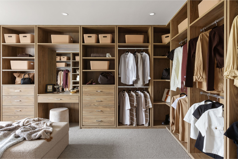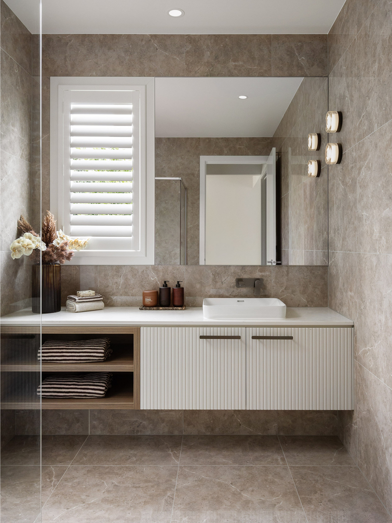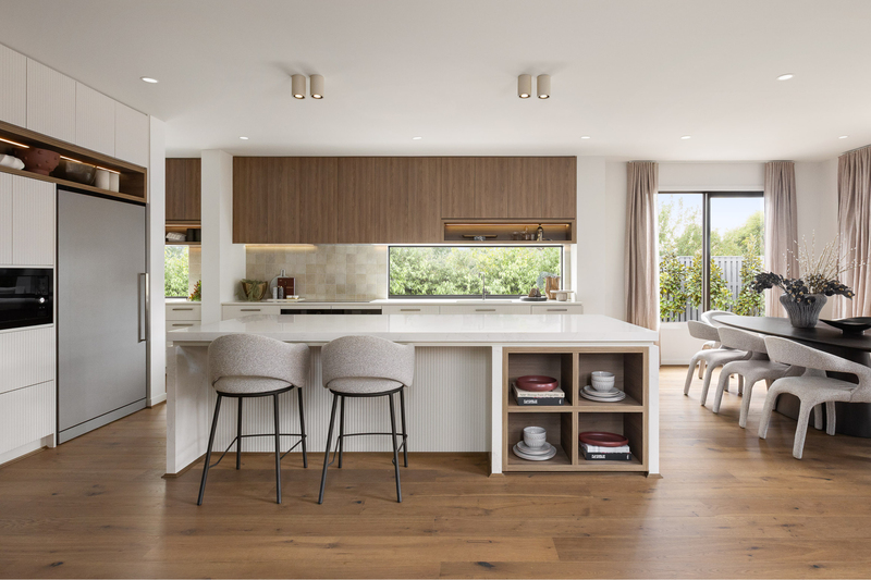 Laminex cabinetry in AbsoluteGrain Refined Walnut brings warmth and depth, balanced by Caesarstone Solenna benchtops that soften the space while standing up to daily use. Ceiling-height cabinetry keeps everything neatly in its place, while the walk-through butler’s pantry keeps the mess out of sight. It’s a kitchen that performs effortlessly day to day, yet still feels worthy of centre stage when guests arrive.