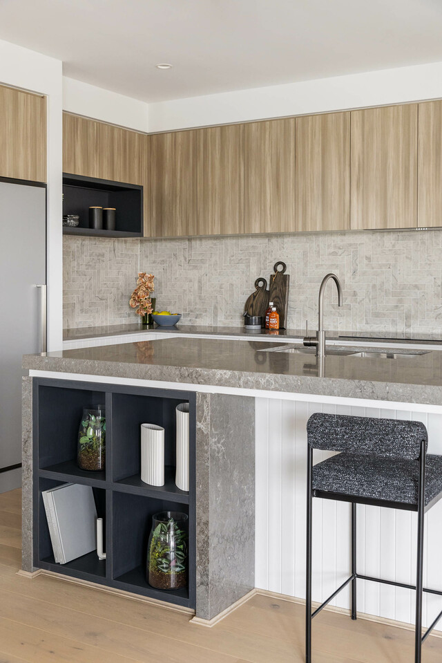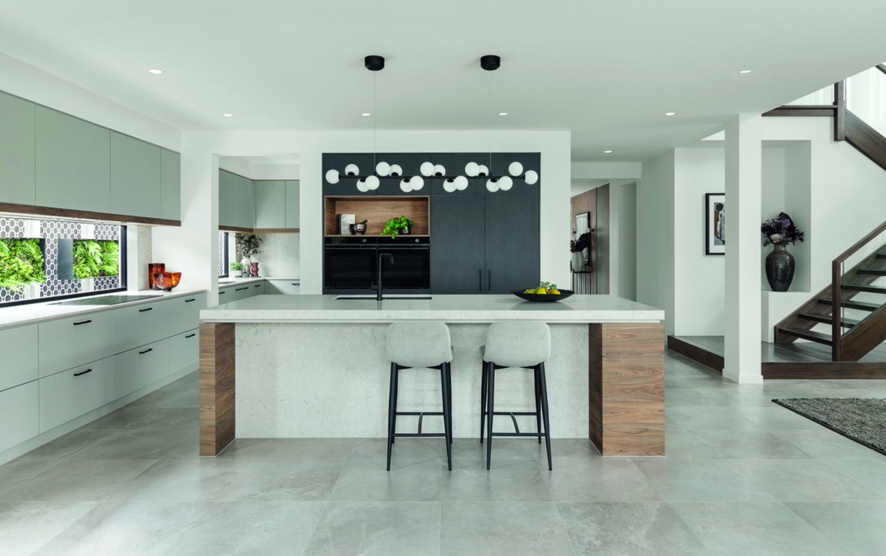 Create a luxurious and welcoming heart of the home with elegant shaker-style cabinetry in glossy black, finished off with natural-look stone benchtop running up the splashback, and a statement black or chrome tap. Alternatively, evoke a sophisticated, natural feel with sleek, dual-tone cabinetry in walnut and parchment grey, paired with elegant brushed nickel tapware.