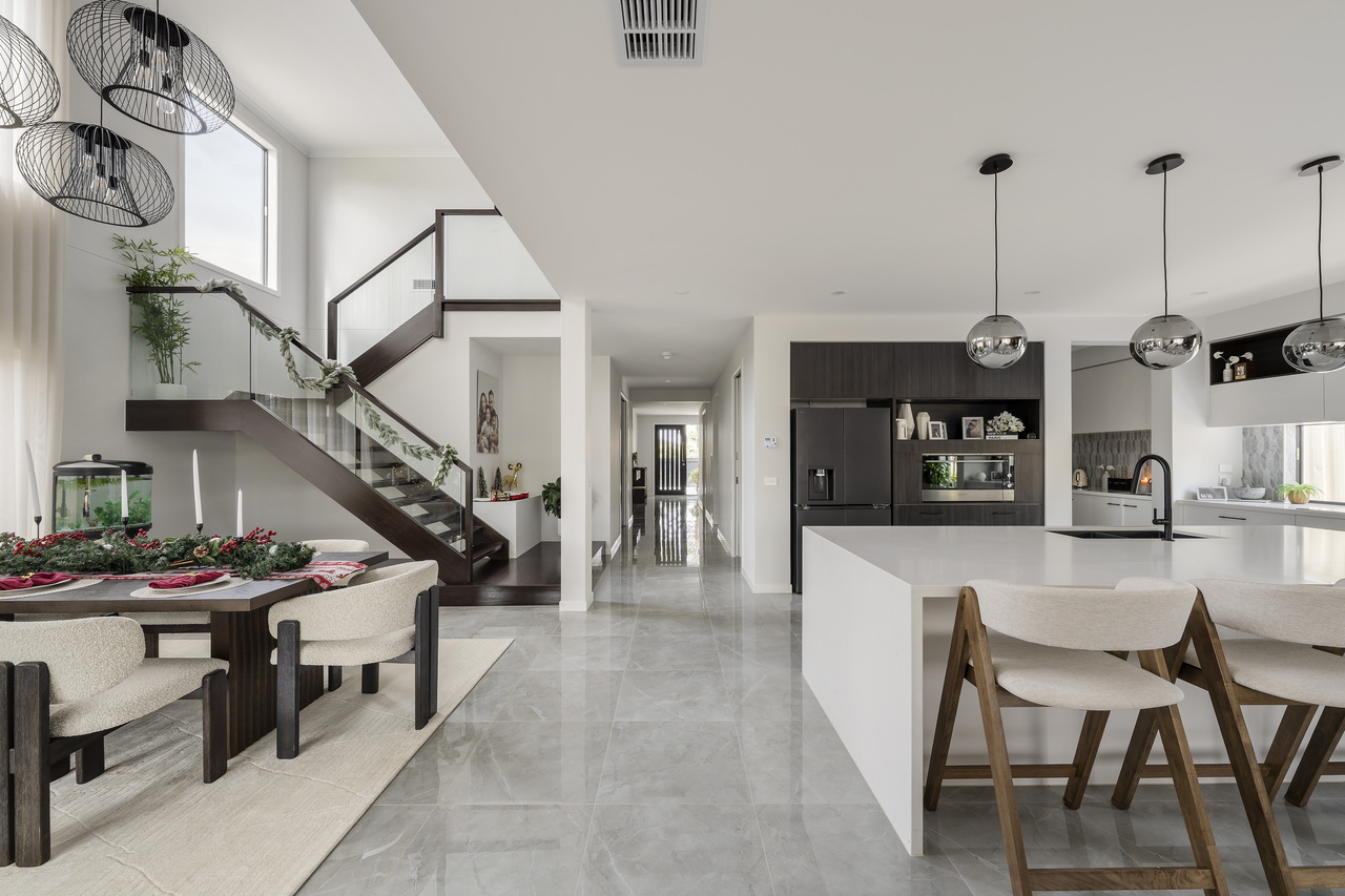 - Stone benchtops and waterfall island: Upgraded stone throughout, including a 40mm waterfall edge to the kitchen island for a more luxurious, durable finish.