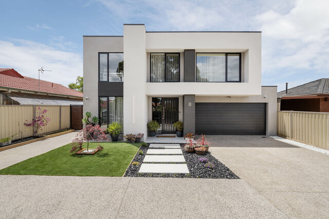 From the street, the home makes a strong statement. Clean lines, a bold black garage door and front entry, and a crisp mix of white and charcoal Hebel create a contemporary façade that still feels welcoming.