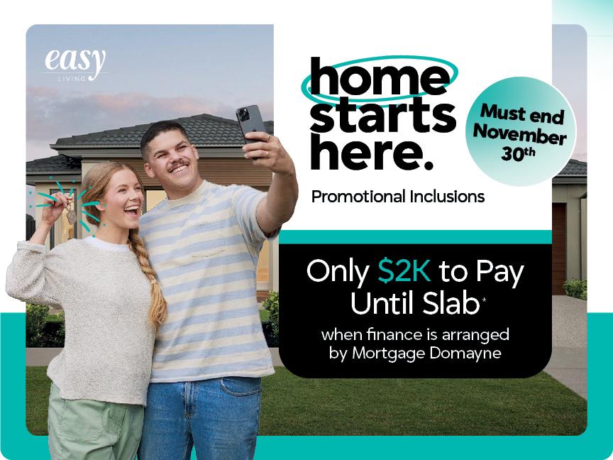 EasyLiving is making it easier to get into your new home sooner, thanks to our fast and affordable process with only $2K to pay until slab* when financed through Mortgage Domayne.